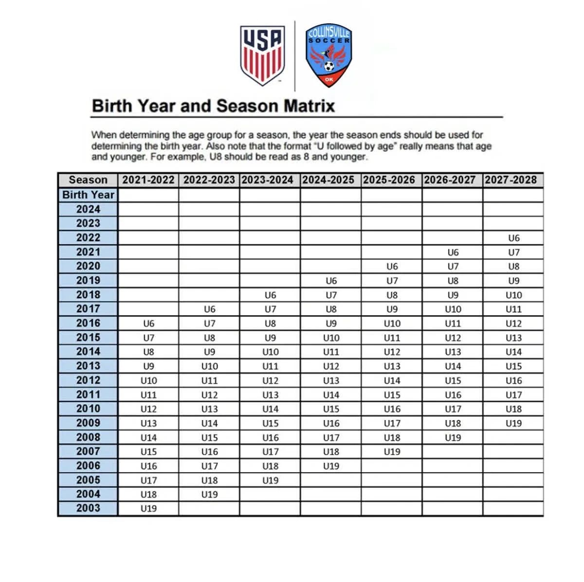 Birth year registration is based on the year in which the season ends. For example, if a season begins in the Fall of 2025 and ends in the Summer of 2026.